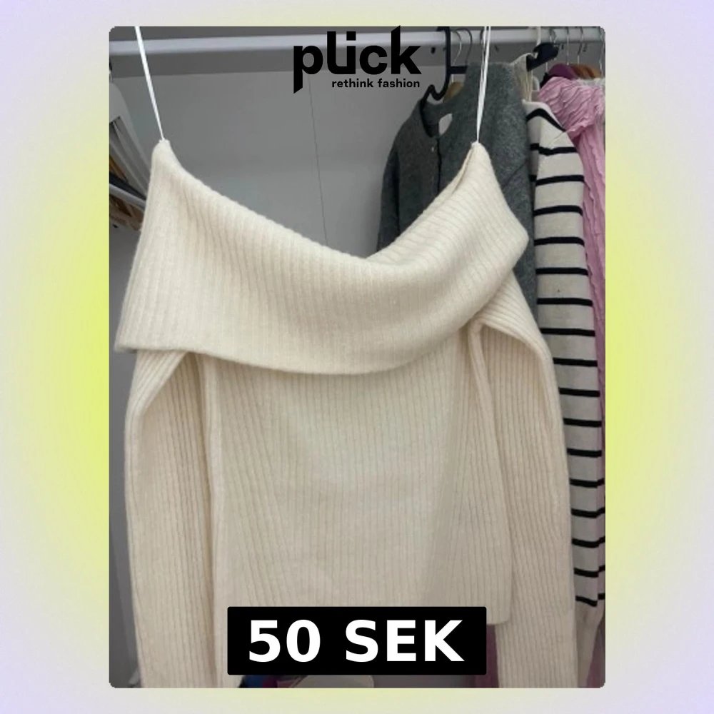 Säljer en superfin offshoulder stickad tröja i ribbat material. Tröjan är krämvit och har en bred, nedvikt krage som ger en snygg och avslappnad look. Perfekt till höst och vinter för dig som vill ha något både mysigt och trendigt.