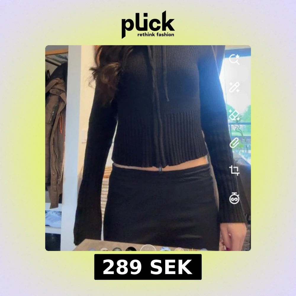 Säljer en svart croppad stickad hoodie med dragkedja framtill och huva. Tröjan har långa ärmar och ribbad struktur, perfekt för en trendig och avslappnad look.