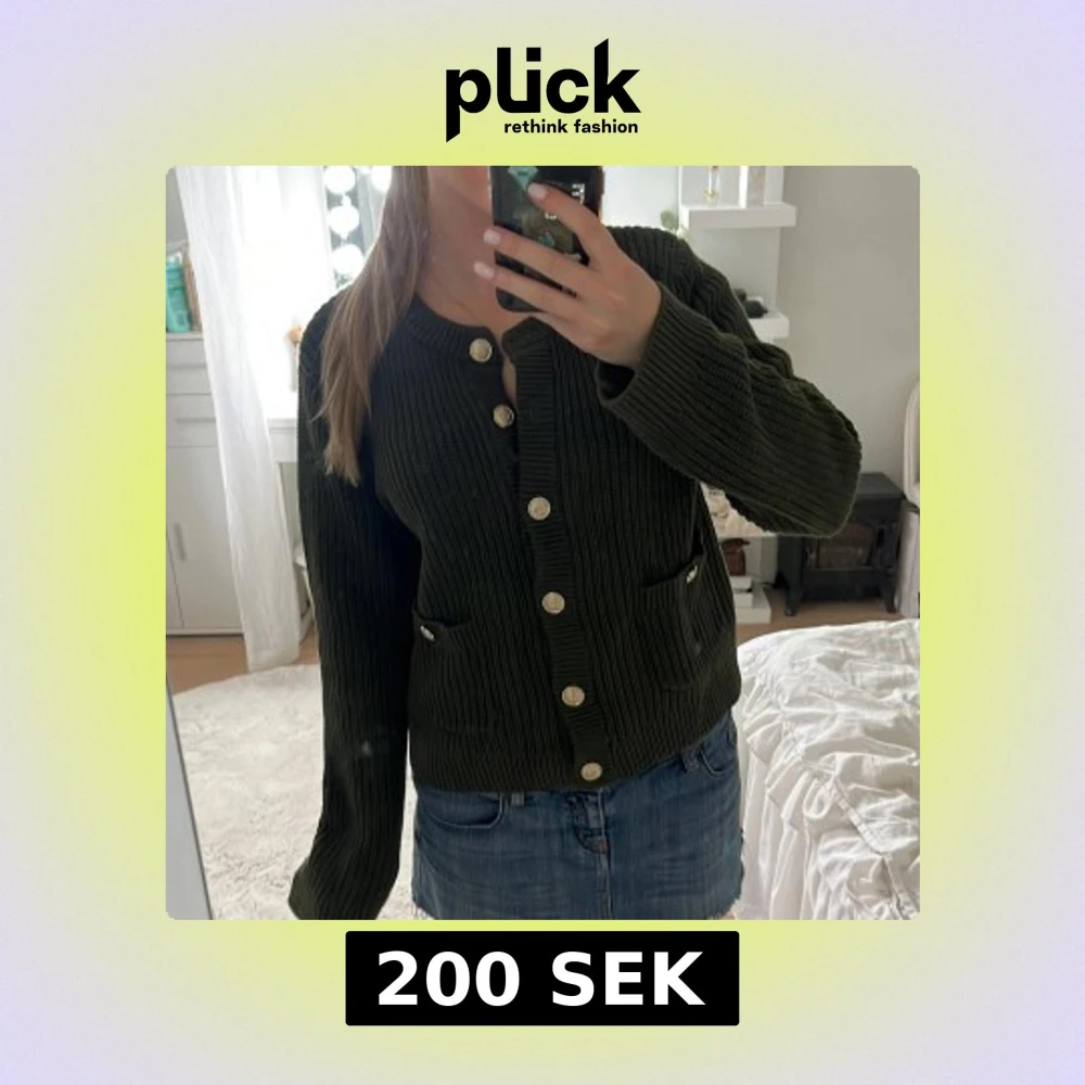 Säljer en mörkgrön stickad kofta från H&M i storlek S. Koftan har snygga guldknappar framtill, två små fickor och en ribbad struktur. Perfekt att slänga över en t-shirt eller linne för en chill look.
