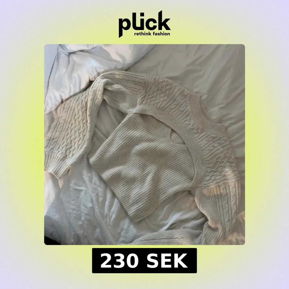 Säljer en beige croppad stickad tröja med snygg kabelstickad struktur på ärmar och axlar. Tröjan har rund hals och långa ärmar.
