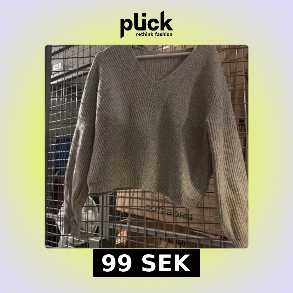 Mysig grå stickad tröja från H&M med v-ringning och croppad passform. Tröjan har långa ärmar och ribbad struktur, perfekt för kyligare dagar .står ingen storlek men skulle tippa på en S