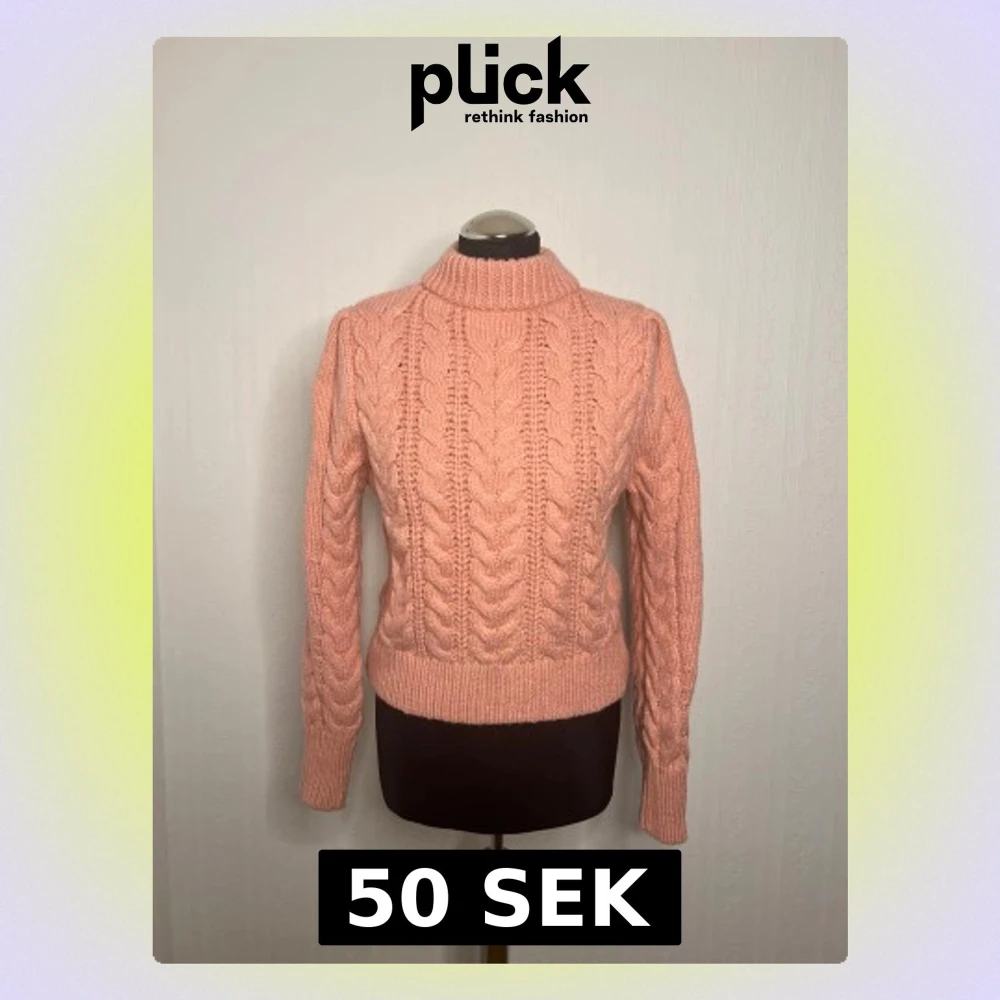 Säljer en rosa stickad tröja från H&M i storlek S. Tröjan har ett snyggt flätstickat mönster, ribbad krage och muddar. Perfekt för dig som gillar mysiga och trendiga plagg med lite puff i axlarna och långärmad design.