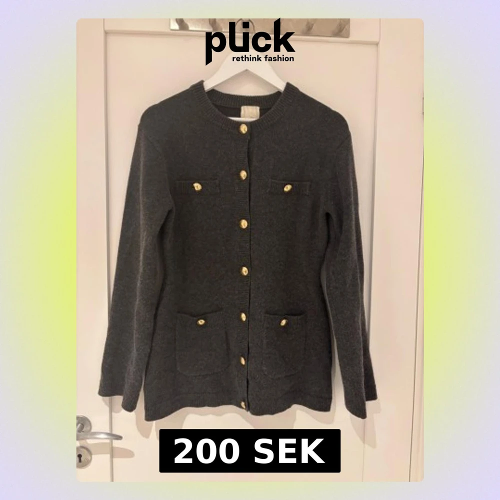 Snygg mörkgrå kofta från H&M med guldfärgade knappar framtill och på fickorna. Koftan har rund hals, två bröstfickor och två fickor nedtill. Stickad i mjukt material och har långa ärmar. Perfekt för dig som gillar klassiska detaljer.