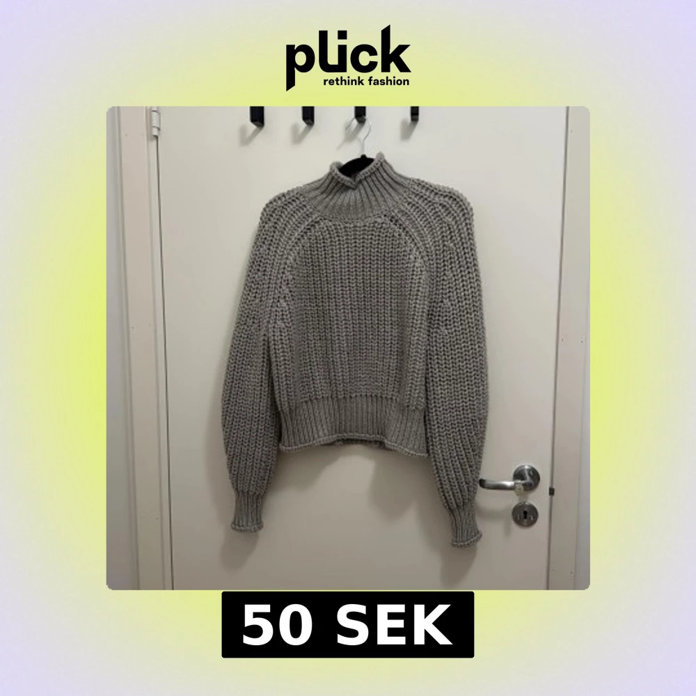 Säljer en chunky grå stickad polotröja från H&M med grov ribbad struktur och hög krage. Tröjan har långärmade ballongärmar och breda muddar som ger en cool och avslappnad vibe. Perfekt för att hålla sig varm under kyliga dagar.