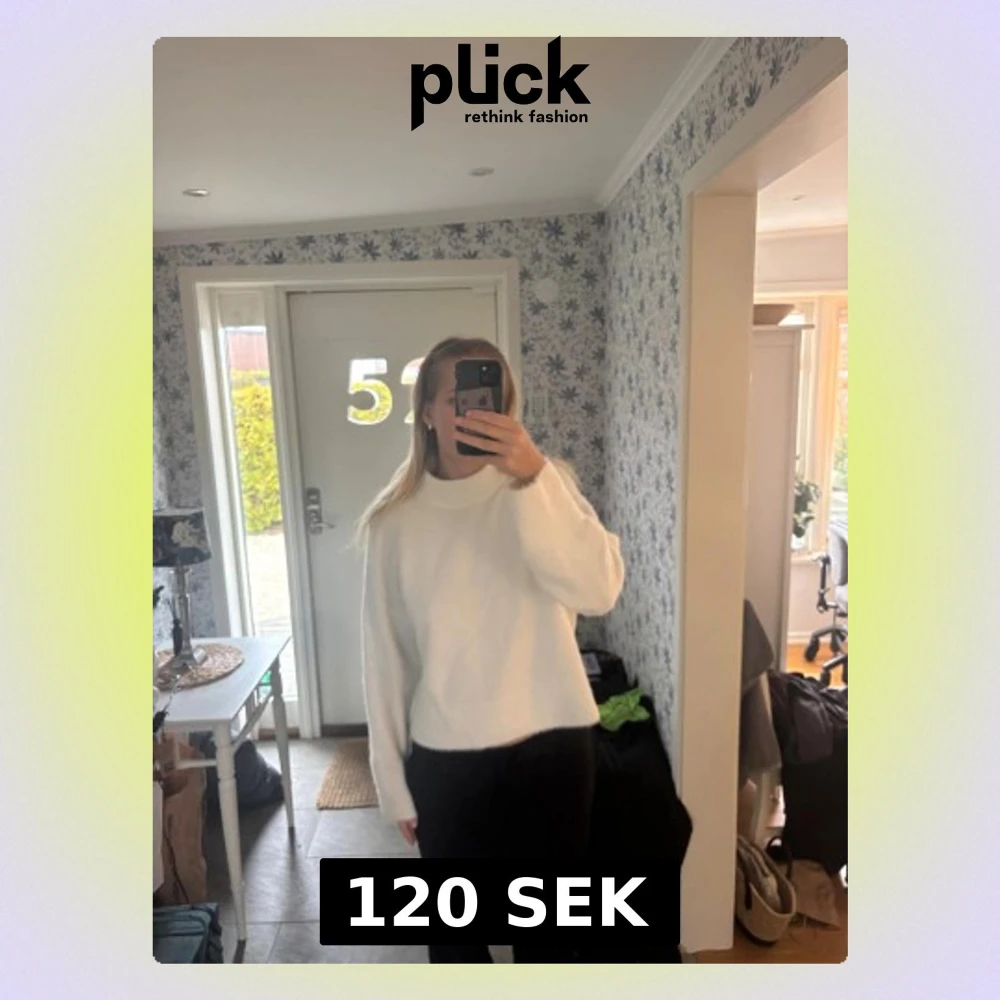 Mysig vit stickad tröja från H&M i storlek S. Tröjan har en högre rund hals, långärmad passform och är lite croppad. Materialet är fluffigt och mjukt, perfekt för kyligare dagar. Enkel och clean look som är lätt att styla.