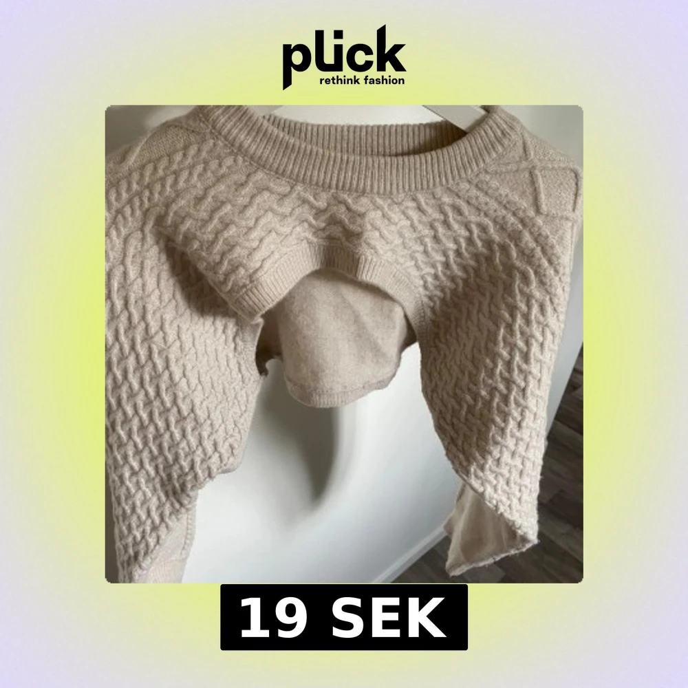 Säljer en beige croppad stickad tröja från H&M i storlek S. Tröjan har ett snyggt flätstickat mönster framtill och längs ärmarna, ribbad halsringning och långa ärmar. Perfekt för lager-på-lager och chill höst- eller vinterstil.