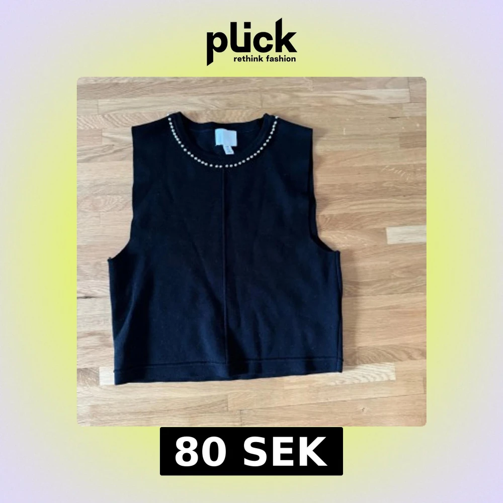 Svart ärmlös topp från H&M med rund halsringning dekorerad med silvriga pärlor. Modellen är croppad och har en stilren, rak passform. Perfekt för dig som gillar enkla detaljer med lite edge. Materialet känns mjukt och har en stickad känsla.