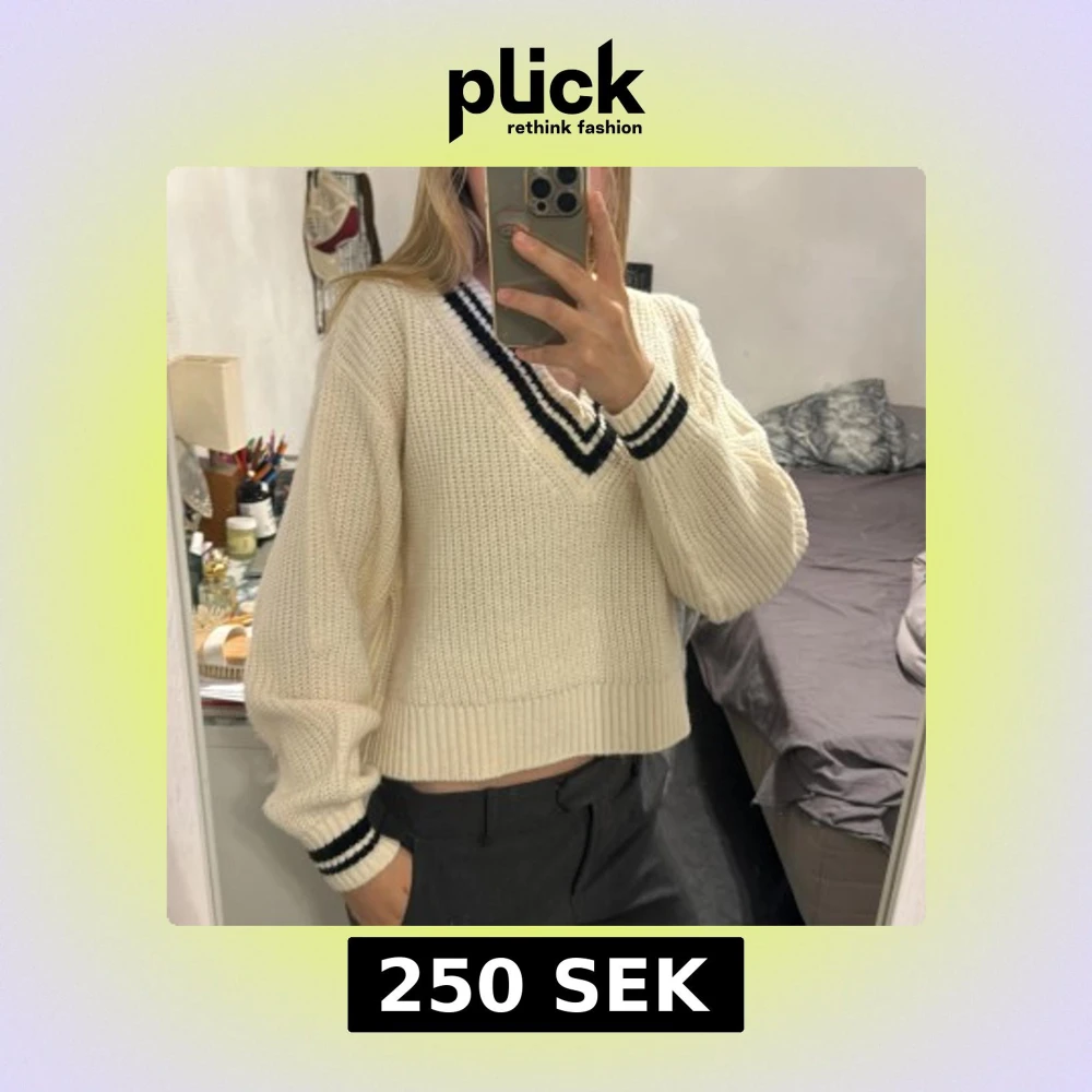 Säljer en vit stickad tröja från H&M med v-ringning och svarta ränder vid halsringning och ärmslut. Tröjan är croppad med breda muddar och har en loose passform. Perfekt för lager-på-lager och chill stil.