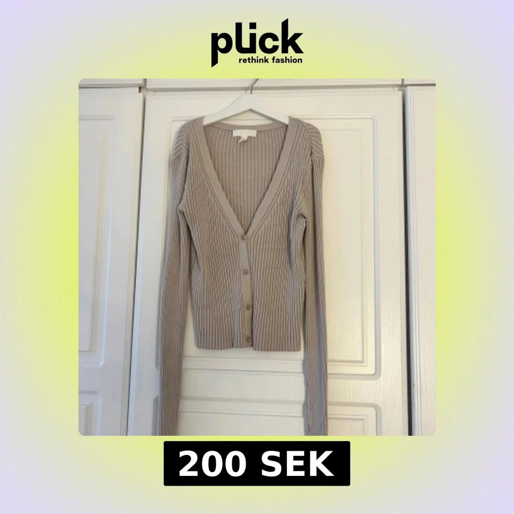 Snygg beige kofta från H&M i storlek S. Modellen är ribbstickad med v-ringning och knappar framtill. Långärmad och i mjukt material som sitter skönt på kroppen. Perfekt att slänga över en topp för en chill look.