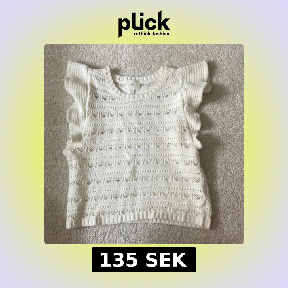 Supersöt vit stickad topp från H&M med volangdetaljer på axlarna och ett snyggt hålmönster över hela plagget. Toppen är ärmlös och har en rund halsringning. Perfekt för dig som gillar en romantisk och chill stil.