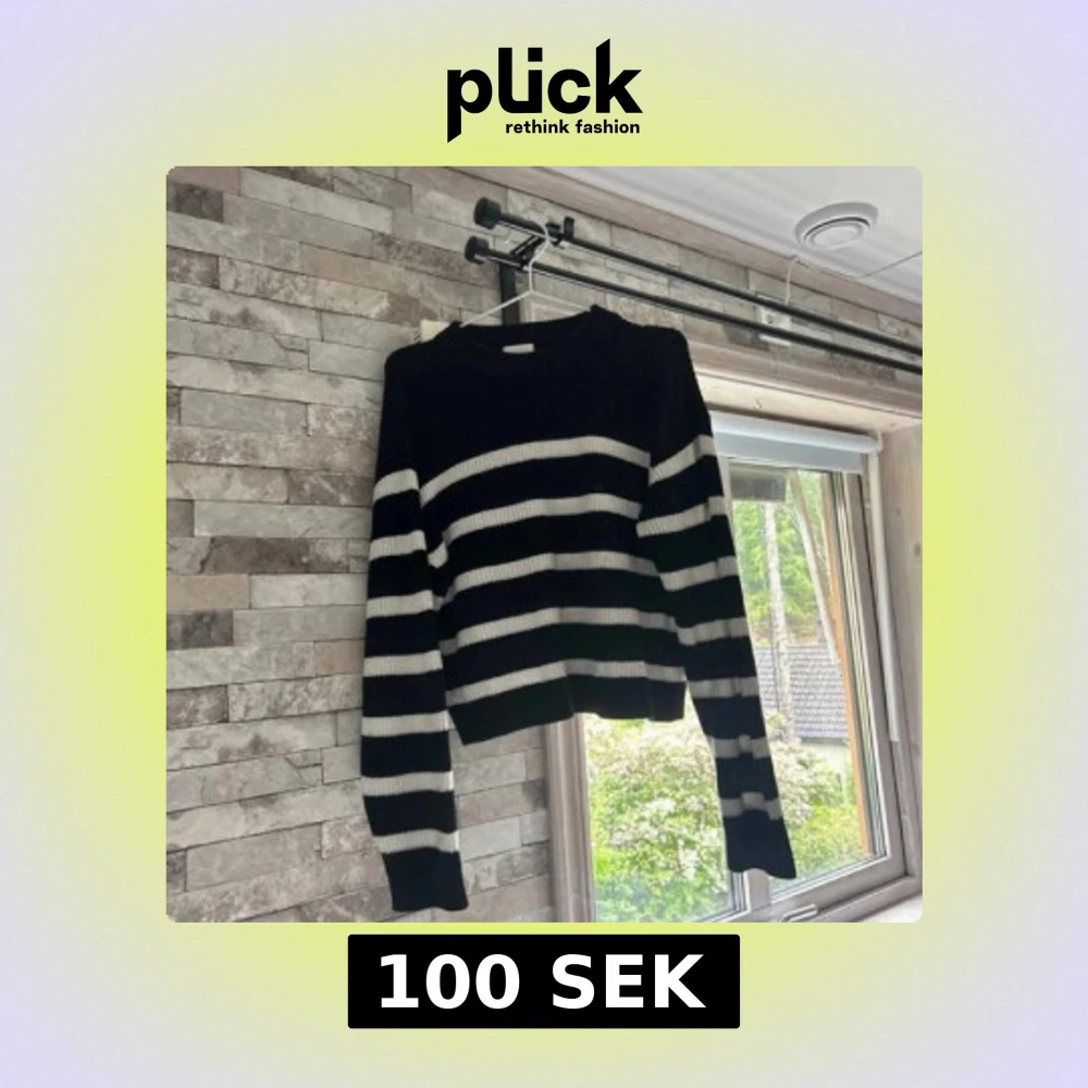 Säljer en svart stickad tröja från H&M med vita horisontella ränder. Tröjan har en croppad passform, rund halsringning och långa ärmar. Perfekt för dig som gillar en chill och trendig stil.