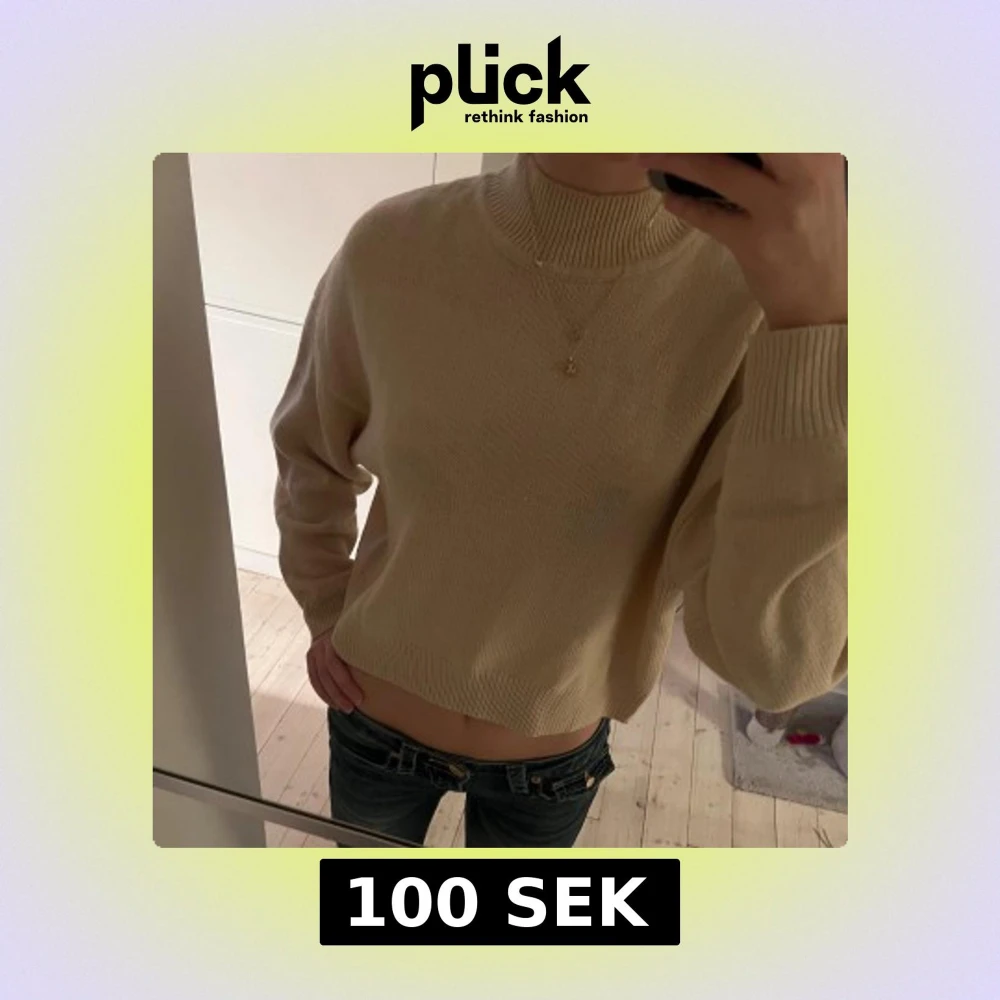 Supermysig beige stickad tröja med croppad passform och hög ribbad krage. Tröjan har långa ärmar och breda muddar vid ärmslut och nederkant. Perfekt att styla med jeans för en chill look.