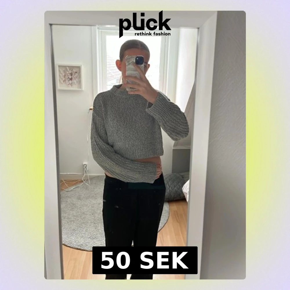 Säljer en grå croppad stickad tröja med lång ärm och högre hals. Tröjan har en loose fit och är perfekt för lager-på-lager-stil. Enkel och stilren design som passar till många outfits.