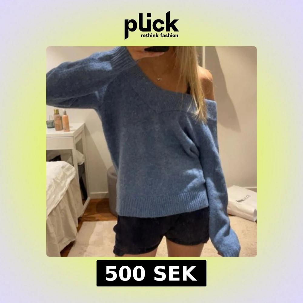 Säljer denna blå stickade tröja med offshoulder-design och bred ribbad kant vid halsringning, ärmslut och nederkant. Gammal från hm så säljs inte längre.
