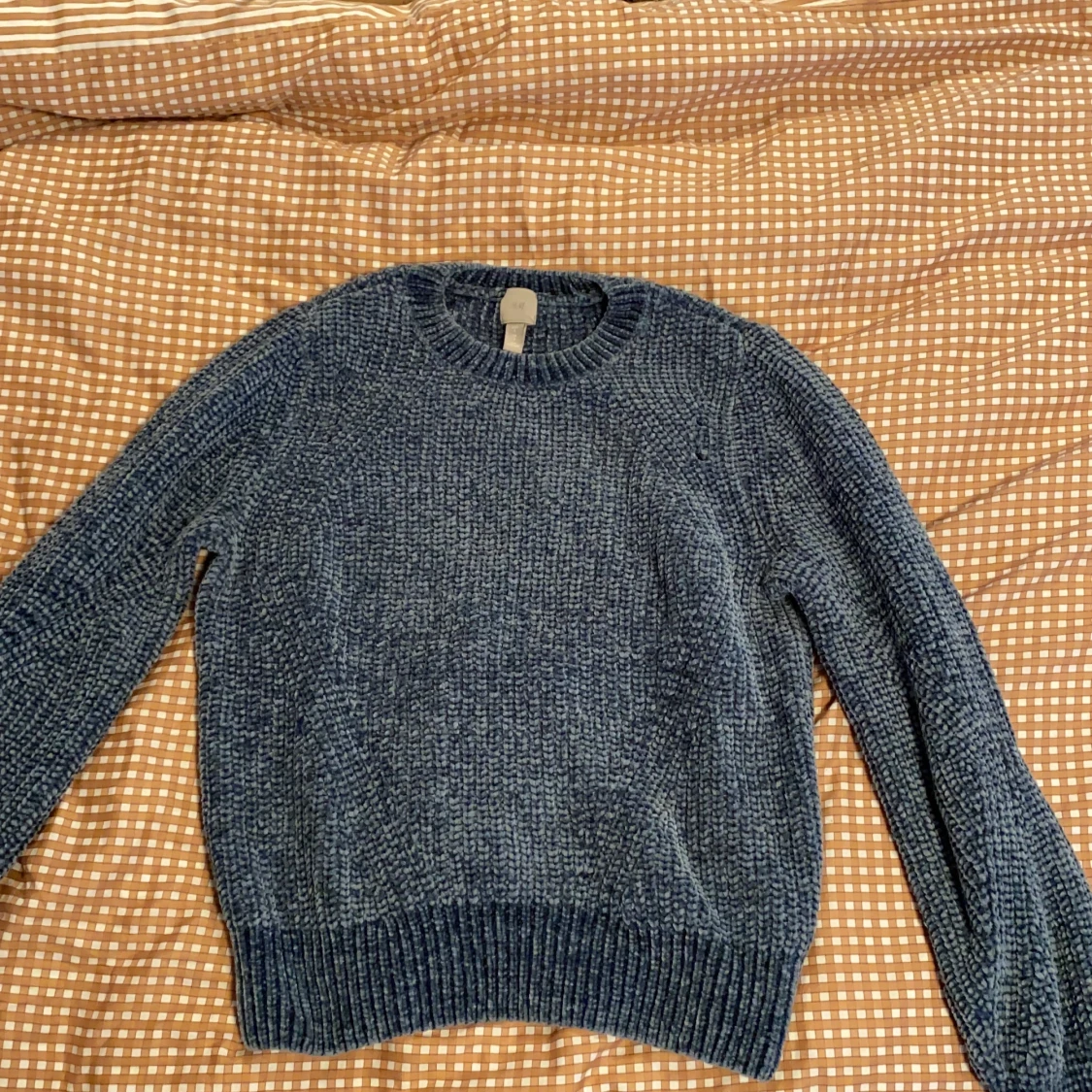 En blå stickad tröja från H&M. Betala med Swish