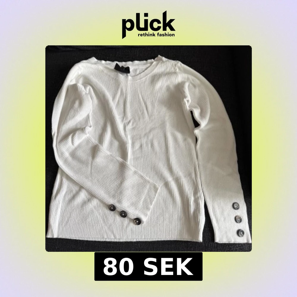 Vit ribbad långärmad tröja med rund hals och snygga svarta knappar på ärmsluten. Tröjan har en clean och stilren look som passar perfekt till jeans eller kjol. Materialet känns mjukt och stretchigt, vilket gör den riktigt skön att ha på sig.