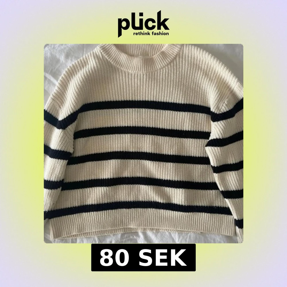 Säljer en krämvit och svart stickad tröja från H&M i storlek XS. Tröjan har breda svarta ränder, rund hals och ribbade muddar vid ärmslut och nederkant. Perfekt för dig som gillar klassisk och chill stil.