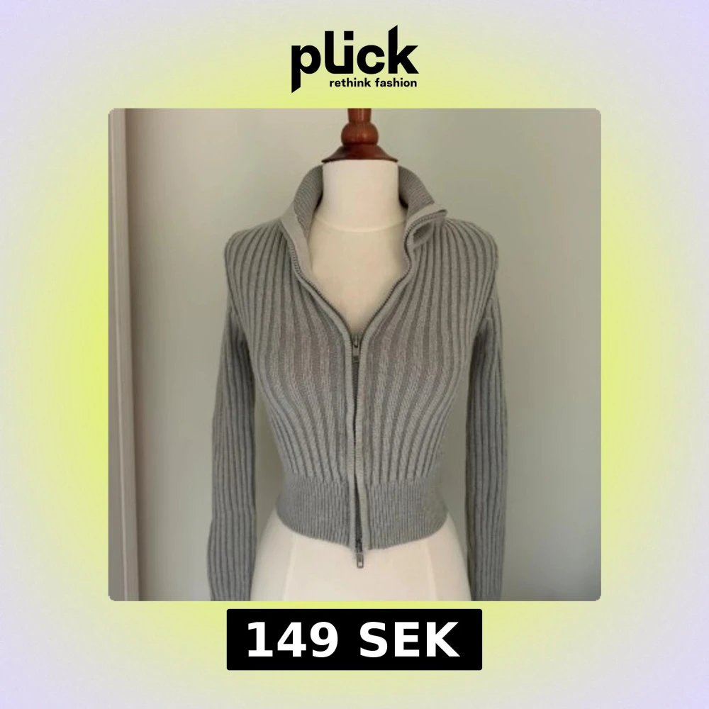 Snygg grå ribbstickad kofta med hög krage och hel dragkedja framtill. Modellen är croppad och har långa ärmar, perfekt för lager-på-lager. Materialet är stickat och ger en skön och mjuk känsla. Passformen är slim och framhäver midjan.