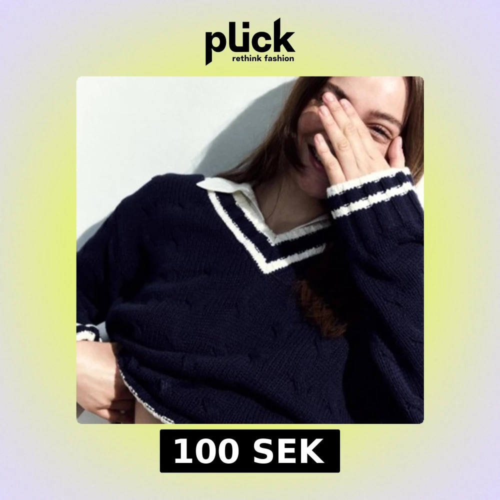 Säljer en mörkblå stickad tröja med vit v-ringad krage och ribbade muddar. Tröjan har ett sportigt utseende med strukturstickat mönster och passar perfekt till jeans eller kjol.
