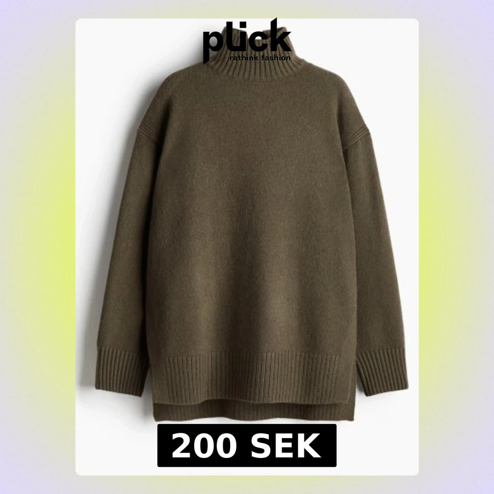 Säljer en olivgrön polotröja med hög ribbad krage och breda muddar. Tröjan har en loose passform och är tillverkad i mjuk ullmix, perfekt för kyliga dagar. Enkel och stilren design som är lätt att matcha.