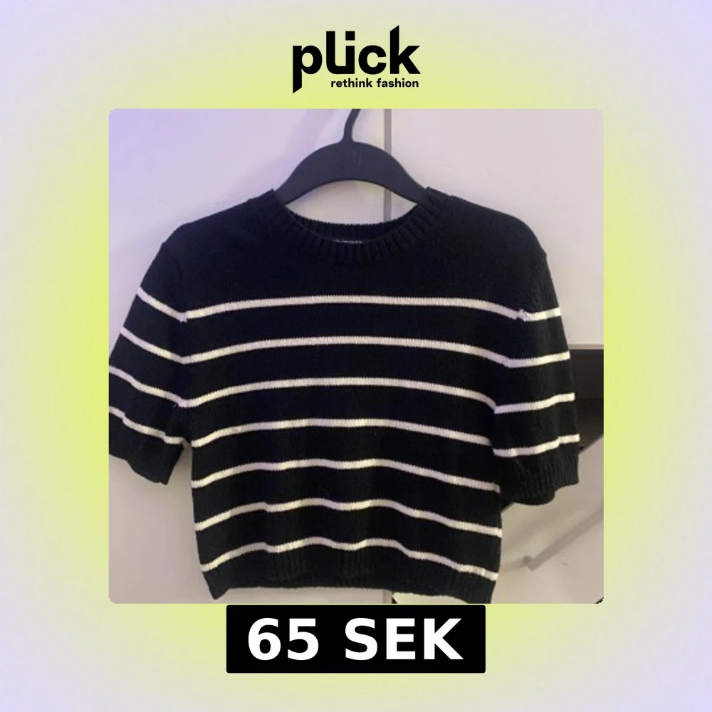 Svart stickad tröja från H&M i storlek XS med vita horisontella ränder. Tröjan har korta ärmar, rund halsringning och croppad passform. Perfekt för dig som gillar en enkel men stilren look med lite edge.