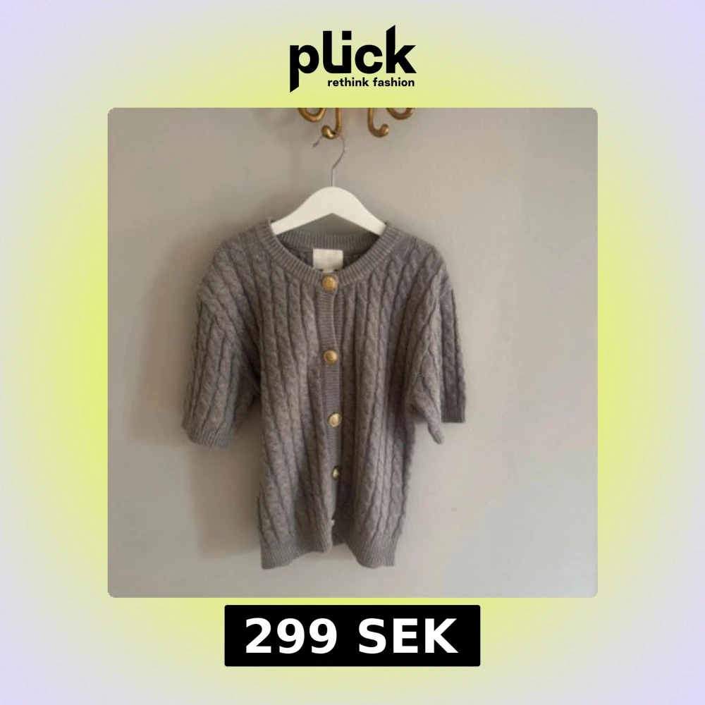 Grå kabelstickad kofta med kortare ärmar och snygga guldknappar framtill. Koftan har rund halsringning och ribbade muddar vid ärmslut och nederkant. Perfekt för lager-på-lager och en chill look.