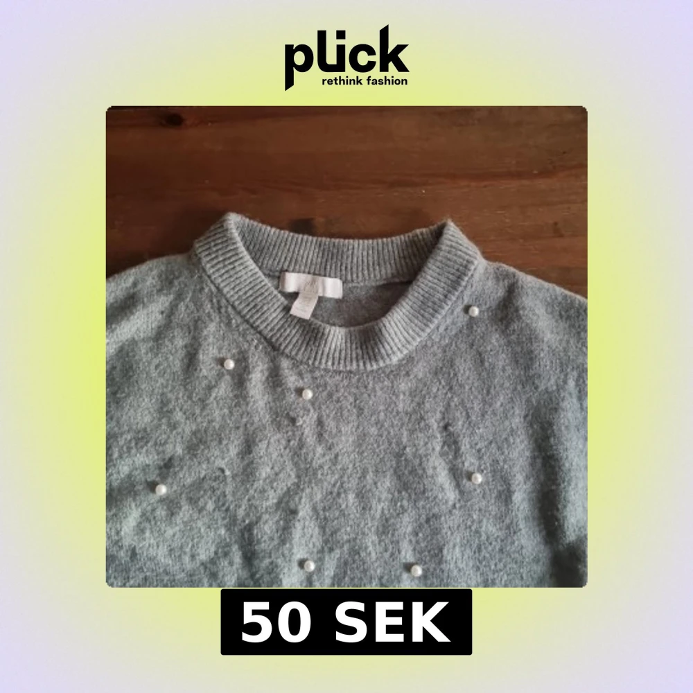 Mysig grön stickad tröja från H&M i storlek XS. Tröjan har rund halsringning, ribbade muddar och är dekorerad med små pärlor framtill för en extra touch. Perfekt för dig som gillar stilrena detaljer och vill ha något som sticker ut lite.