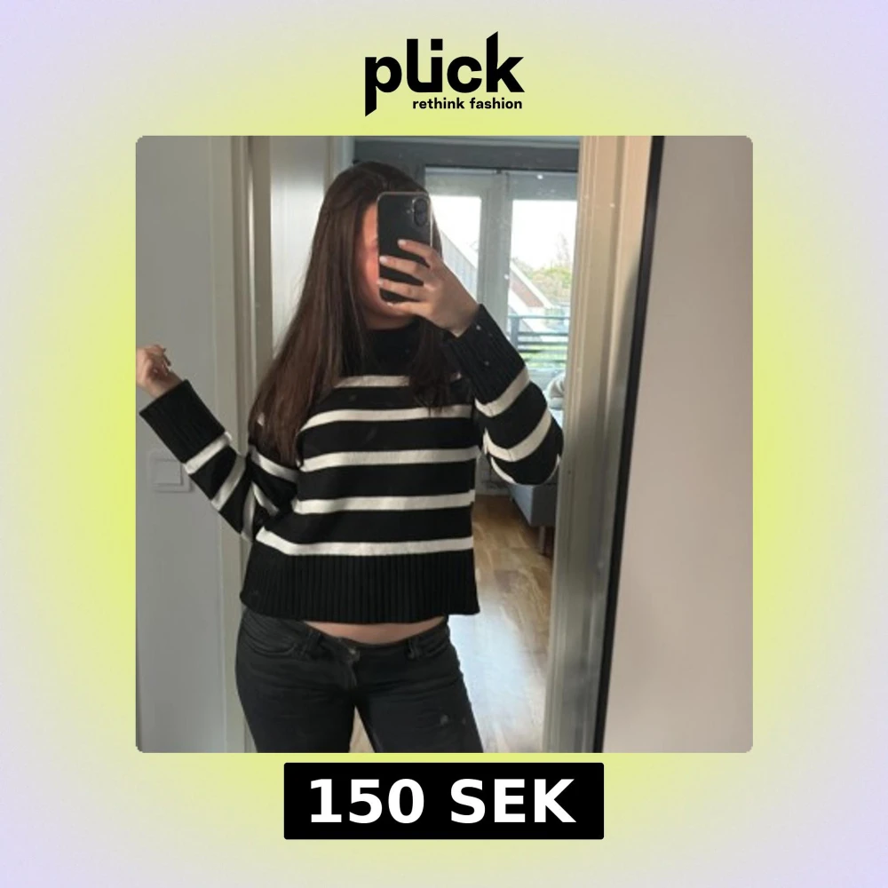 Säljer en svart stickad tröja från H&M med vita horisontella ränder. Tröjan har en croppad passform, ribbade muddar och medium hög hals. Jätte bekväm!