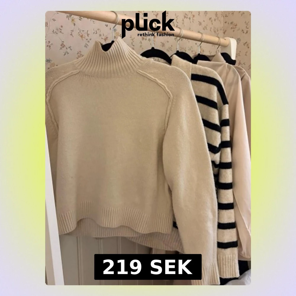 Säljer en beige stickad polotröja med hög krage från H&M . Tröjan är lite åt det kortare hållet, slutar ungefär vid mitten av rumpan. Perfekt för kyliga dagar!
