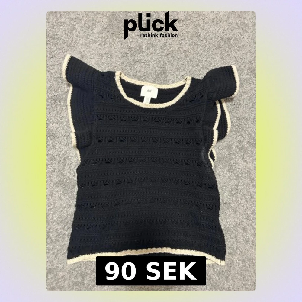 Säljer en svart stickad topp från H&M i storlek XS. Toppen har korta ärmar med volangkant och kontrastfärgade beige detaljer vid halsringning, ärmslut och nederkant. Den är virkad med ett snyggt hålmönster och har en loose passform.