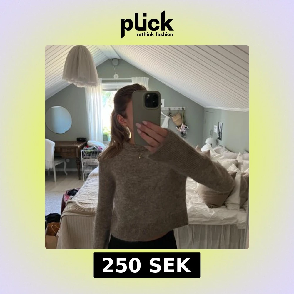 Säljer en mysig beige stickad tröja med croppad passform. Tröjan har långa ärmar och en rund halsringning. Mohair/wool blandning.