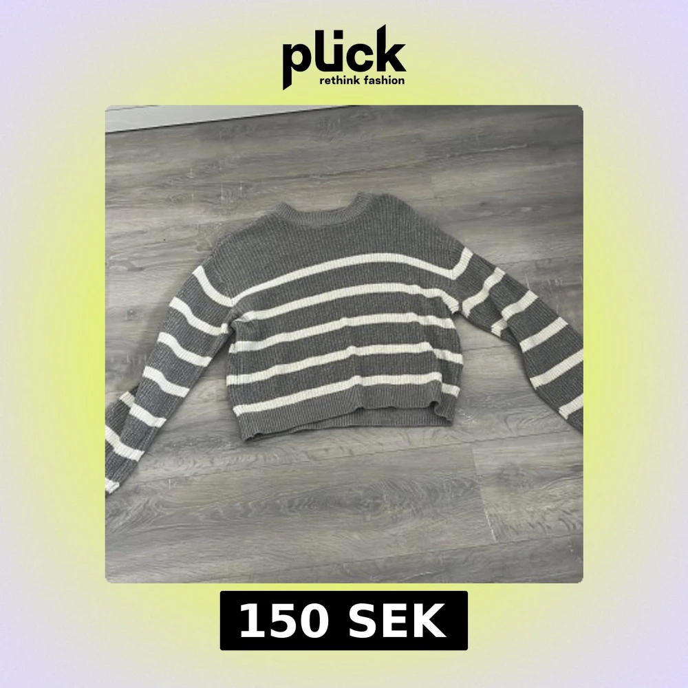 Säljer en ribbstickad tröja i grått och vitt med breda horisontella ränder. Tröjan har en croppad passform, rund halsringning och långa ärmar. Perfekt för dig som gillar en chill och stilren look.