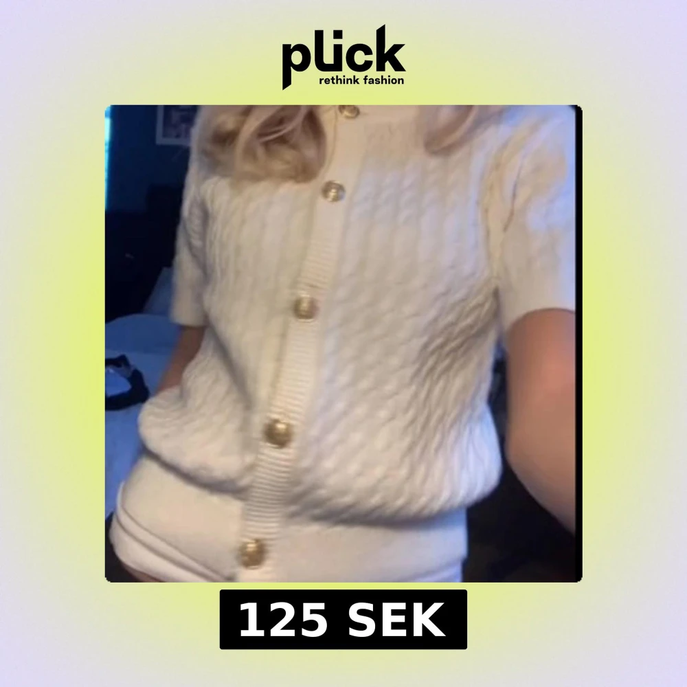 Säljer en vit kortärmad kofta med snygga guldfärgade knappar framtill. Koftan har ett klassiskt kabelstickat mönster och ribbade detaljer vid knappslå och nederkant. Perfekt för dig som gillar en clean och chic stil.