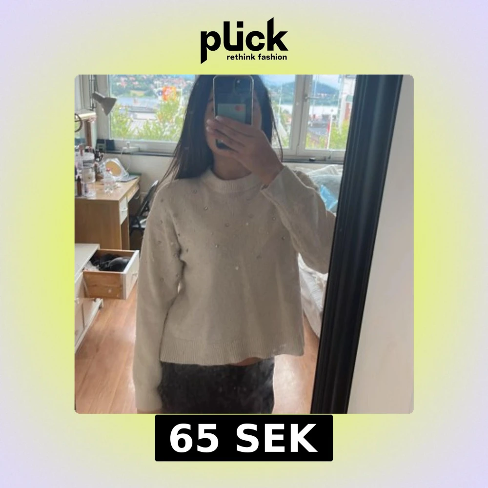 Säljer en vit stickad tröja från H&M i storlek XS. Tröjan har långa ärmar och är dekorerad med små pärlor över hela framsidan och ärmarna. Den har en rund hals och breda ribbade muddar vid ärmslut och nederkant. Perfekt för dig som gillar stilrena detaljer.