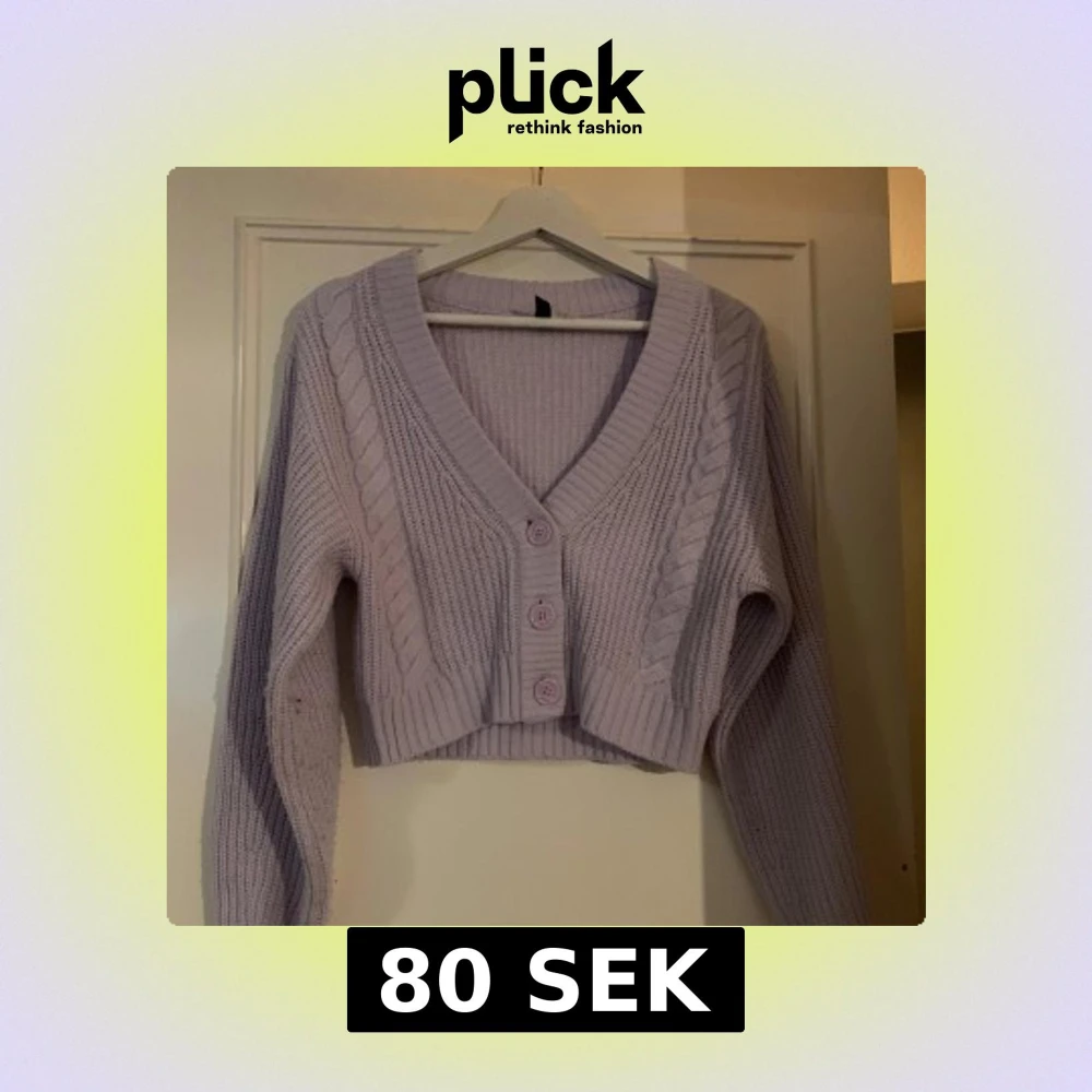 Säljer en söt ljuslila stickad kofta med knappar framtill. Koftan är croppad och har ett flätmönster längs ärmarna och framstycket. Perfekt för en mysig dag. Koftan har dock ett litet hål på baksidan men syns inte om man inte är uppmärksam på det