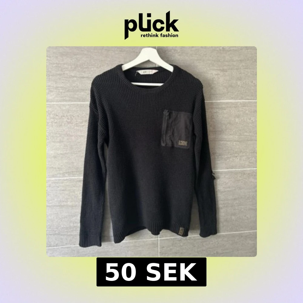 Säljer en svart stickad tröja från H&M med en praktisk bröstficka med dragkedja. Tröjan har en rund halsringning och långa ärmar, perfekt för kyligare dagar.