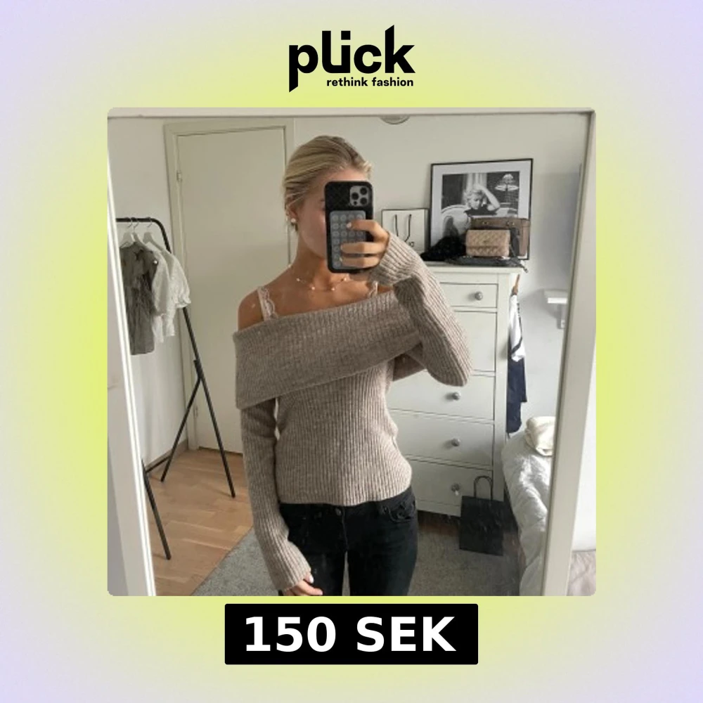 Säljer en beige stickad tröja med ribbad struktur och offshoulder-design. Tröjan har långa ärmar och sitter snyggt med en bred krage som går över axlarna. Perfekt för dig som gillar en chill men ändå trendig look.