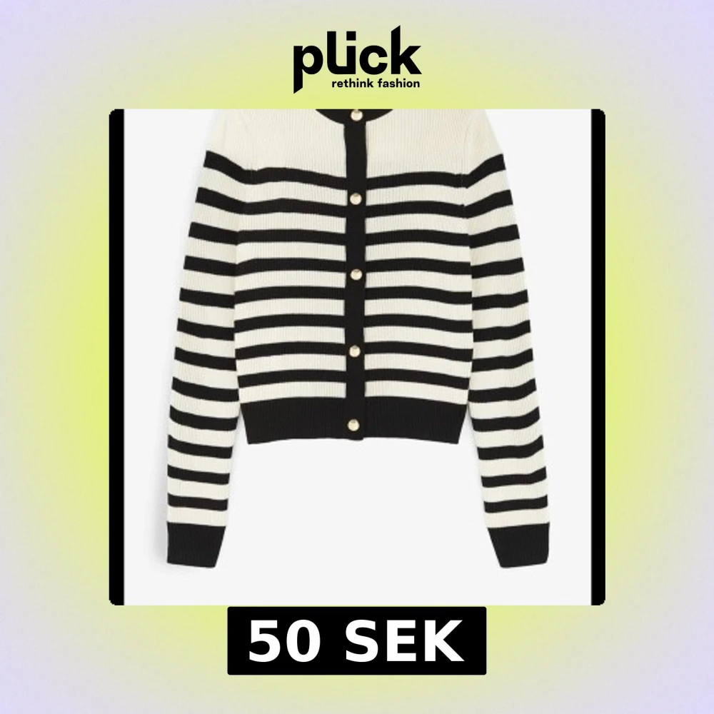 Säljer en ribbstickad kofta från H&M i svart och vitt med klassiskt randigt mönster. Koftan har guldiga knappar framtill, rund halsringning och långa ärmar. Perfekt att slänga över en t-shirt för en snygg look.