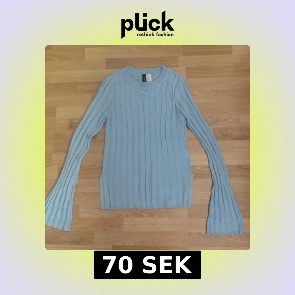Supersöt ljusblå stickad tröja från Divided i storlek XS. Tröjan har ribbat mönster, långa ärmar med lätt utsvängda avslut och rund halsringning. Perfekt för dig som gillar en enkel men trendig look.