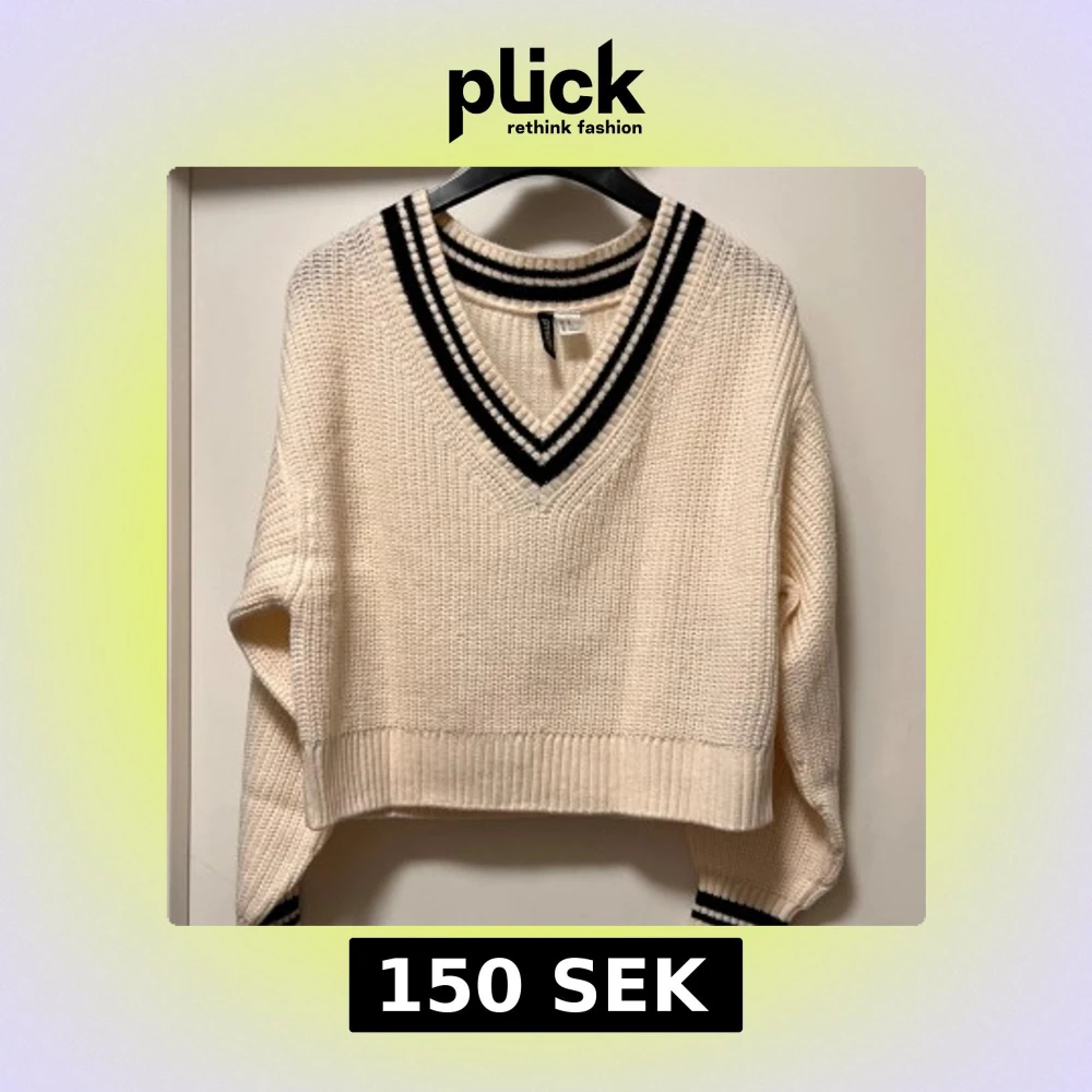Snygg beige stickad tröja från H&M i storlek XS. V-ringad med svarta och vita ränder vid halsen och ärmsluten. Croppad modell med ribbade muddar och loose passform. Perfekt för dig som gillar sportig och trendig stil.