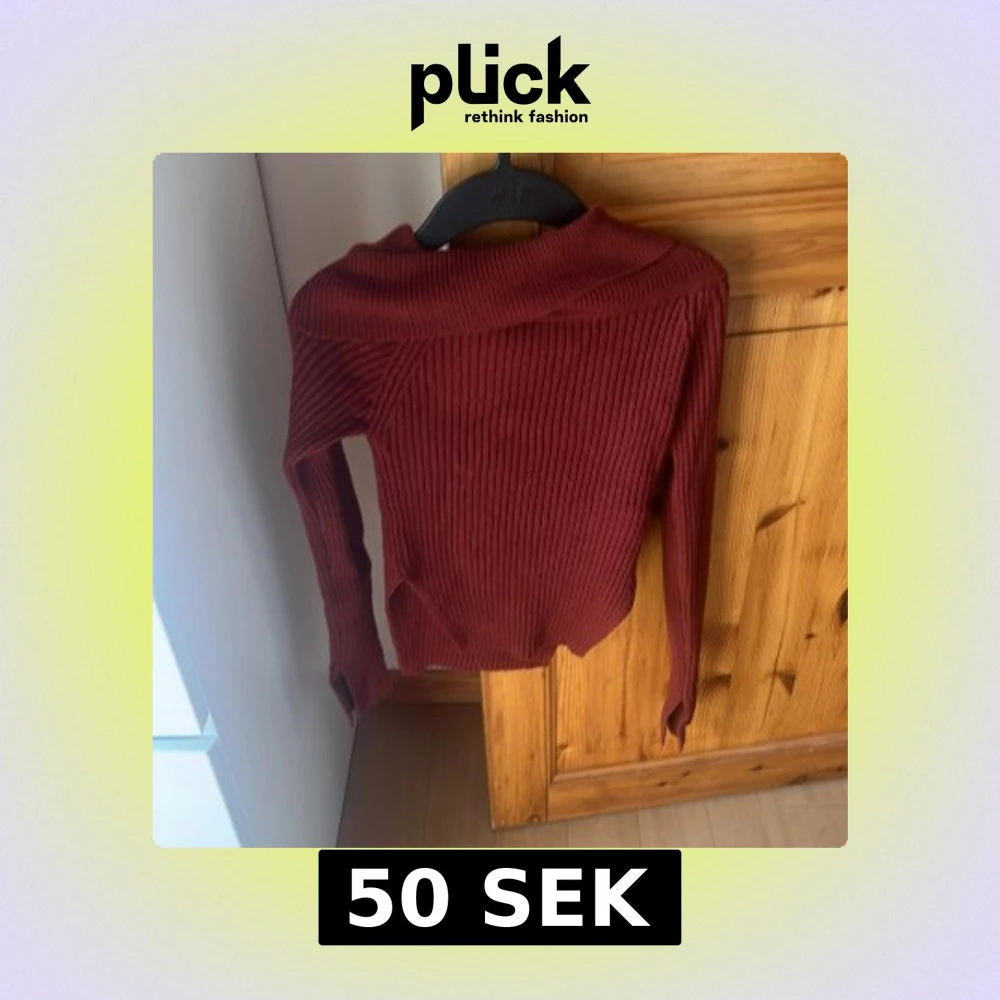 Säljer en mörkröd ribbad stickad tröja från H&M med bredare krage och lång ärm. Tröjan har en snygg, figurnära passform och är perfekt för lager-på-lager. Superenkel att styla till jeans eller kjol för en chill look.