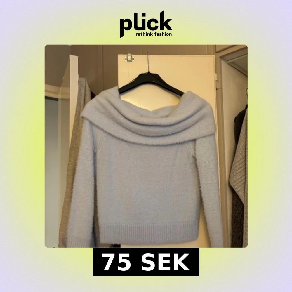 Supermjuk och fluffig ljusblå stickad tröja med bred offshoulder-krage. Tröjan har lång ärm och ribbade muddar nertill. Perfekt för dig som vill ha en mysig men ändå snygg look.