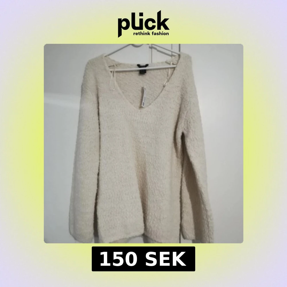 Mysig beige stickad tröja från H&M i storlek XS. Tröjan har en djup v-ringning och snörningsdetalj vid axlarna. Långärmad och loose fit, perfekt för lager på lager under kyliga dagar.