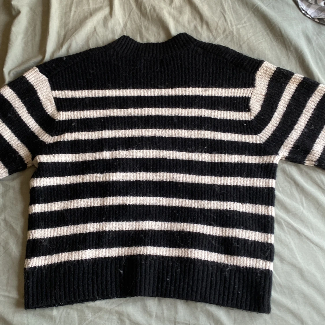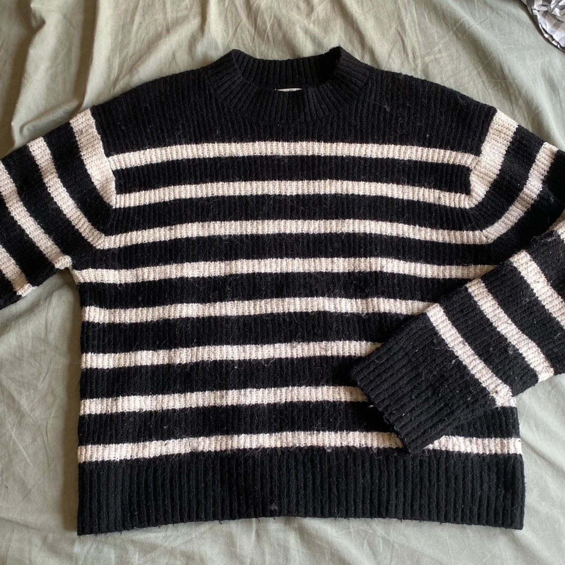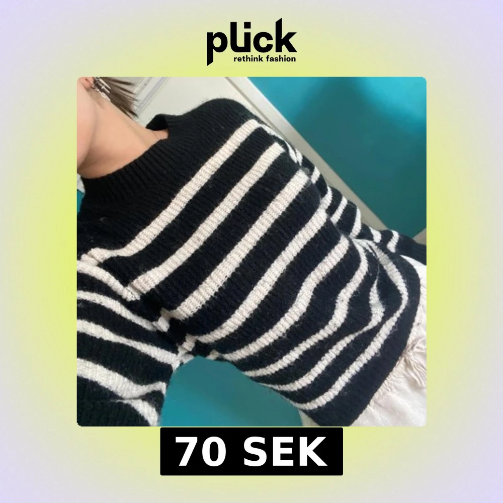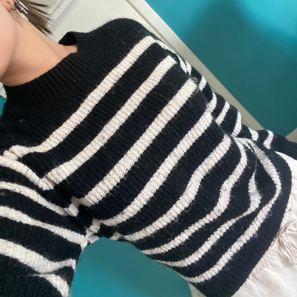 Säljer en stickad tröja med breda svarta och vita ränder. Tröjan har lång ärm, ribbad mudd vid hals, ärmslut och nederkant. Perfekt för dig som gillar klassisk stil med en twist. Supermjuk och skön att ha på sig.