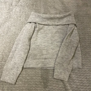 Säljer en söt grå stickad tröja med offshoulder-design från hm. Tröjan har långa ärmar och ribbade kanter, säljer då den tyvärr är lite liten för mig.💕