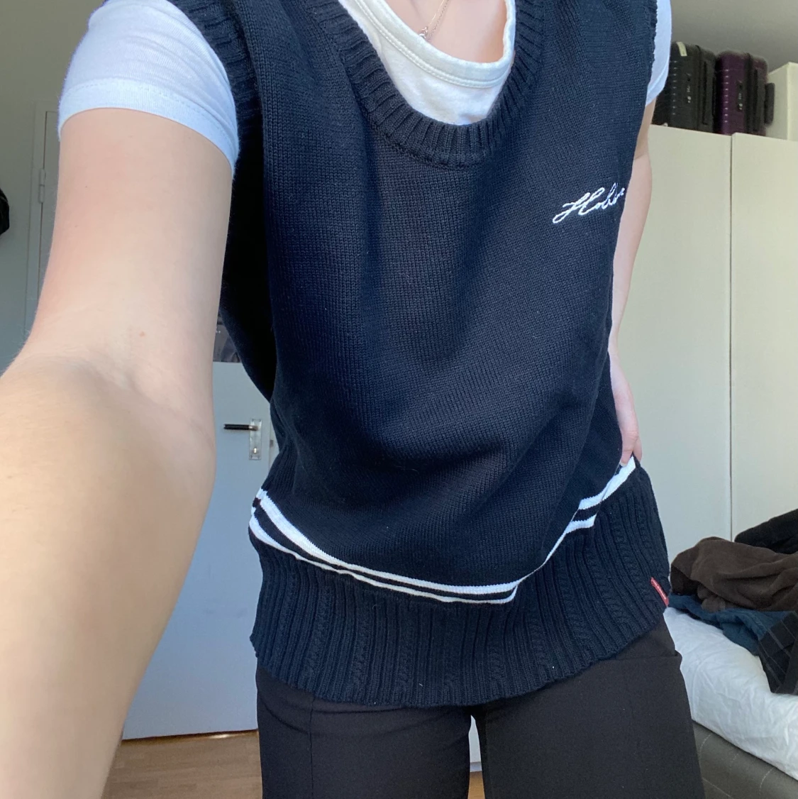 Marinblå stickad väst med vita detaljer. Köpt secondhand men är sparsamt använd. Från märket Holebrook i storlek L men skulle säga att den passar XS-L beroende på hur man vill att den sitter. Jag är 161 cm och brukar ha XS för referens