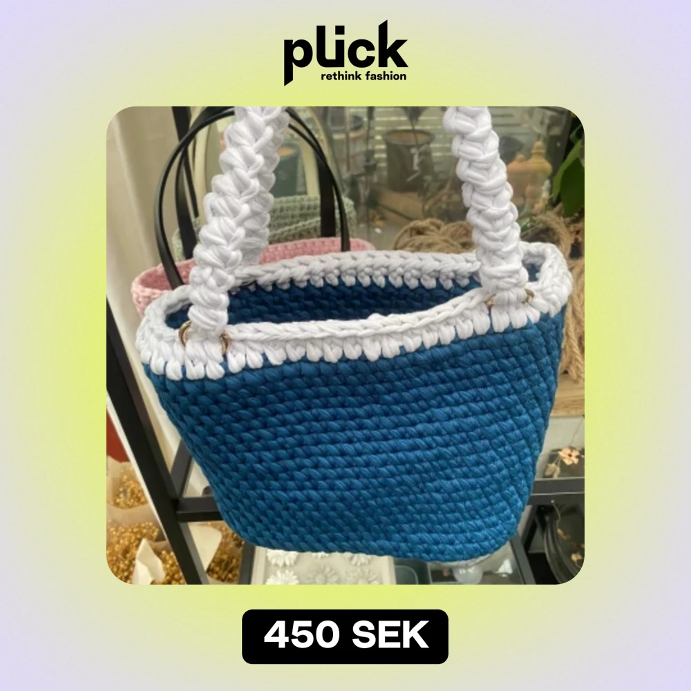Säljer en superfin blå och vit virkad väska med rejäla handtag. Perfekt för sommarens utflykter eller en dag på stan. Väskan har en stabil botten med små metallfötter som skyddar mot smuts. Den är både snygg och praktisk!