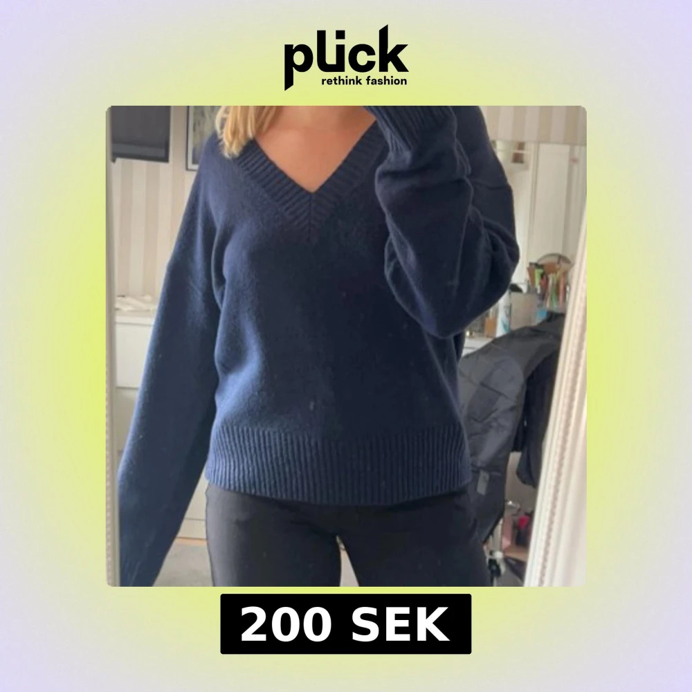 Mysig mörkblå stickad tröja från Nelly med v-ringad hals och breda ribbade muddar vid ärmslut och nederkant. Tröjan har en loose passform och långa ärmar, perfekt för lager-på-lager under kyliga dagar.