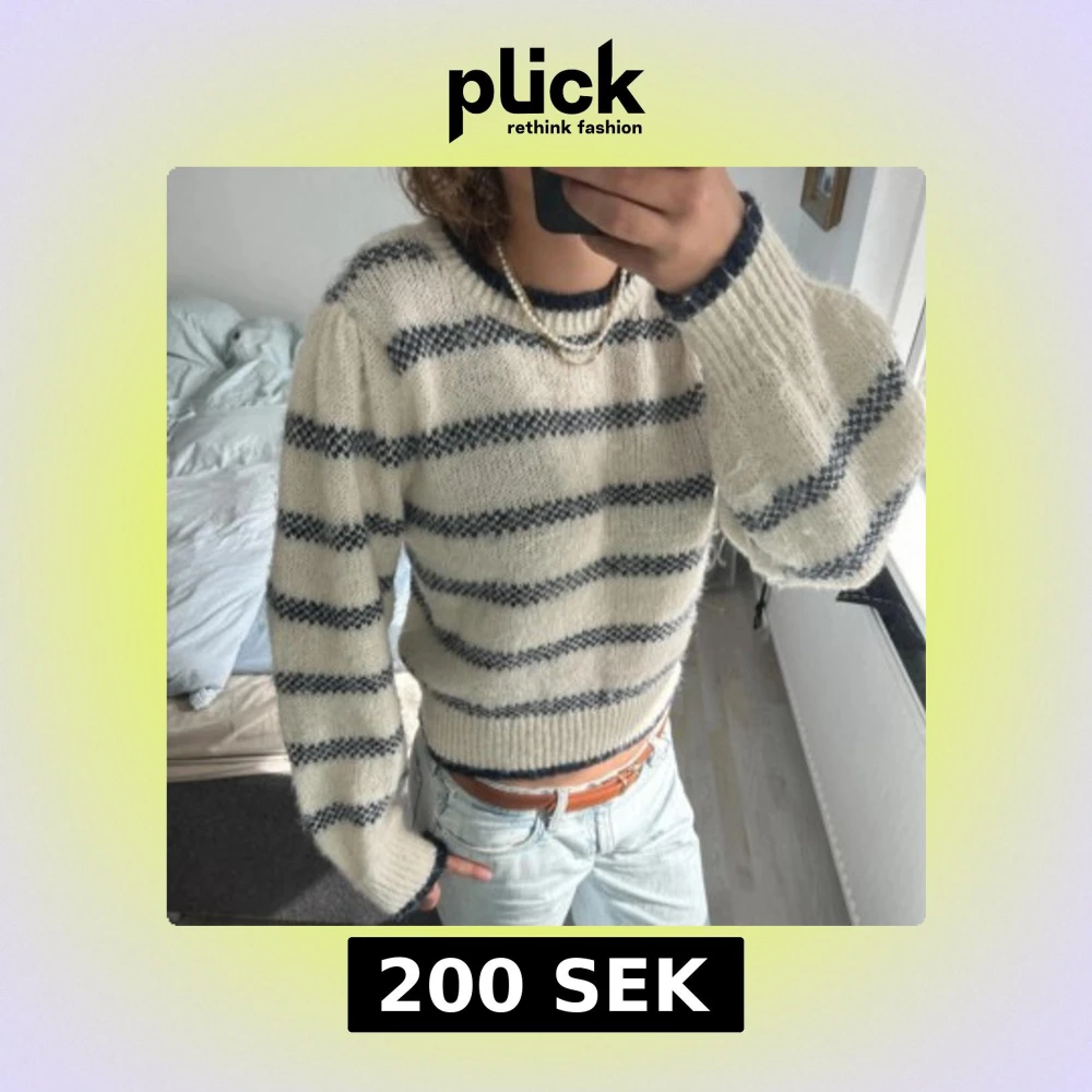 Supermysig stickad tröja med breda, mörkblå ränder på vit botten. Pris kan diskuteras🥰