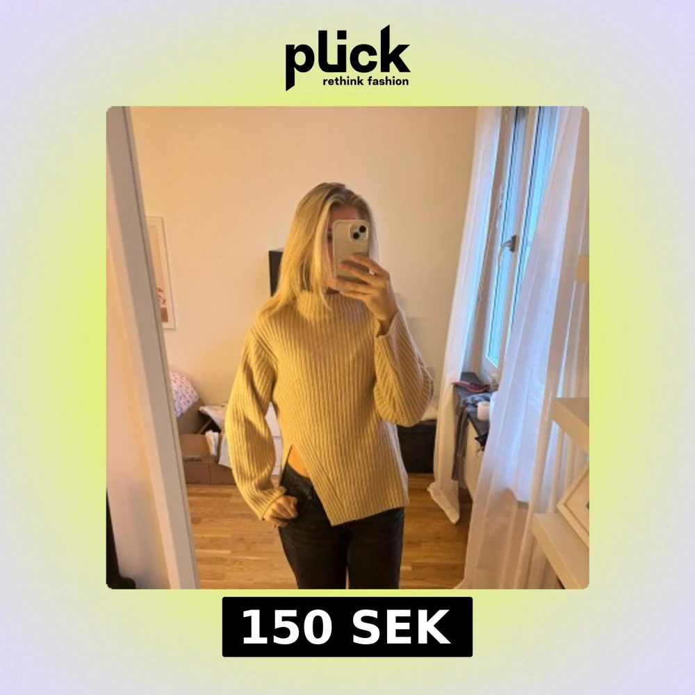 Säljer en beige stickad tröja med ribbad struktur och cool asymmetrisk slits framtill. Tröjan har lång ärm och hög hals, perfekt för dig som gillar en unik och trendig look. Passar dig som vill ha något extra till garderoben.